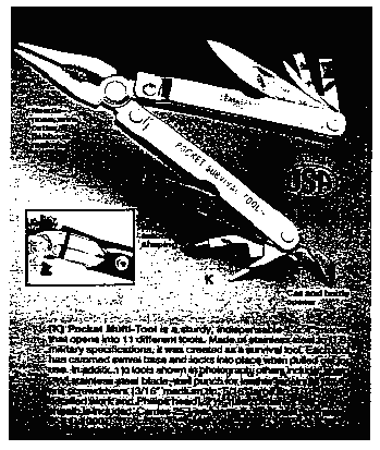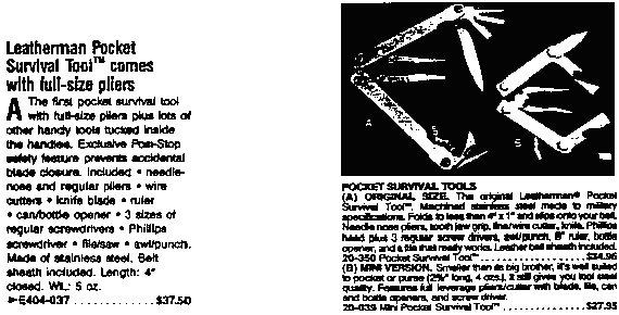 It was then that I remembered that in a burst of self-indulgence I had recently acquired a so-called "Pocket Survival Tool" manufactured by Leatherman, whose innards include several screwdriver blades, a knife blade, a file, a leather punch and needle-nose pliers with a wire cutter. It is a good tool and did the job, and my only criticism of it is that the steel in the cutting edges of the pliers is too soft.--N.Y. Times, July 1, 1985, § C, at 8, col. 1; and