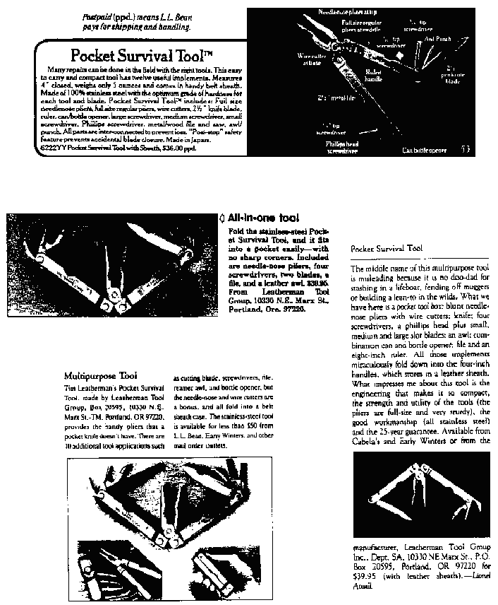 FN8. For example, besides the reference in the Gander Mountain, Inc. catalog to a "Pocket Multi-Tool" and the designation in the L.L. Bean, Inc. Spring 1990 Catalog of a "Pocket Survival Tool with Sheath," the review in the May 1984 issue of Popular Science refers to both an "All-in-one tool" and "the stainless-steel Pocket Survival Tool," while the article in the May 1986 edition of Outdoor Life mentions both a "Multipurpose Tool" as well as "Tim Leatherman's Pocket Survival Tool".